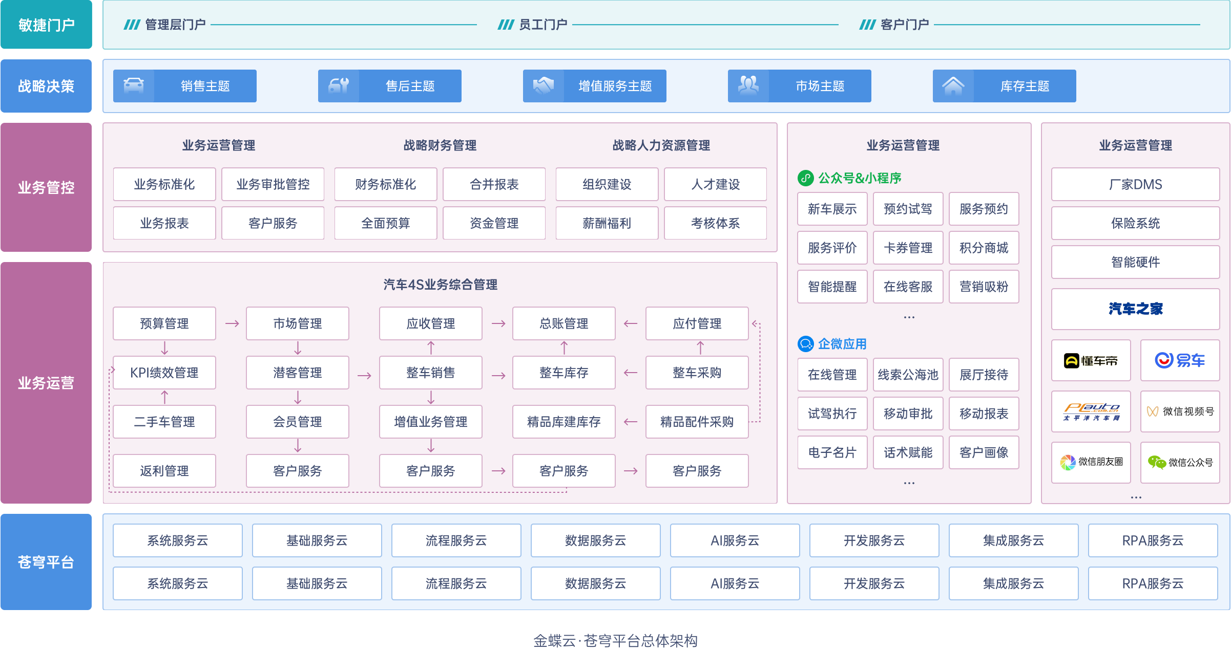 蒼穹·汽車云,基于云原生架構,金蝶云·蒼穹PaaS平臺打造汽車行業產品。以領先的動態領域模型,組裝、復用業務能力;以可視化報表、數據對標分析模型,指導業務,輔助決策;結合百余家大中型集團數字化轉型的成功經驗,助力汽車經銷商集團構建敏捷、高效、穩定、一體化的數字平臺,實現管理精細化到智能化發展。
